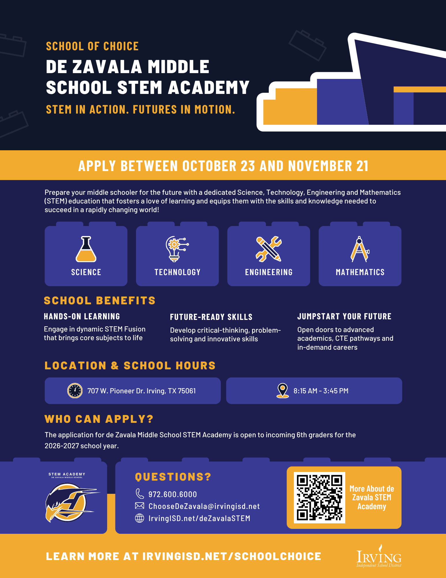 Incoming 6th graders (current 5th graders) may apply for the STEM Academy at de Zavala Middle School for the 2026-2027 school year.